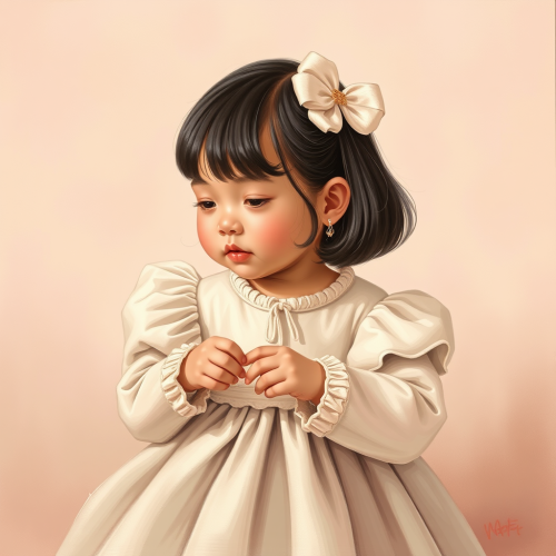Draw a cute little girl with bangs and two braids, holding a cute little Schnauzer in her hand. Realistic style