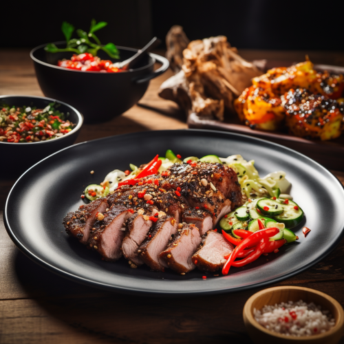 delicious black pepper pork steak with vegetable side dishes, kampot red peppercorns, grinding pepper, on the dish, ready to serve, food styling for food photography, natural light on the table