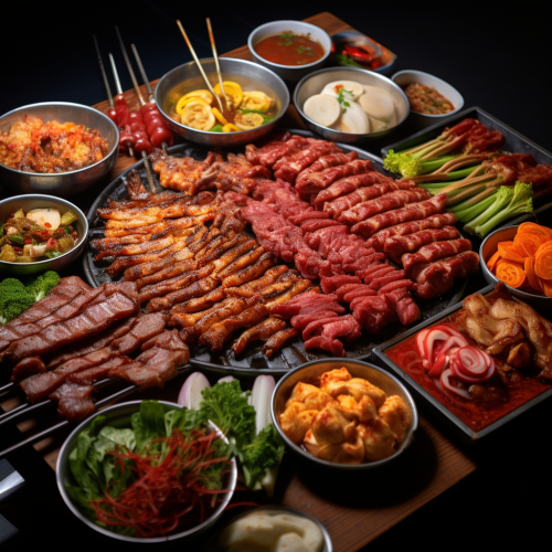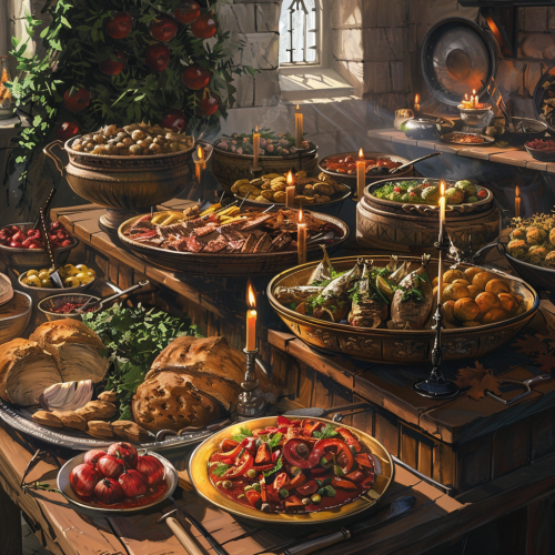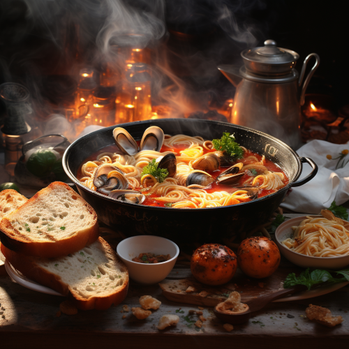 beautiful food, tasty, delicious, yummy, delicate, hyper realistic, steaming soup, fruits and vegetables, noodles, pizza, hamburger, fish and sea food, steaming bread,