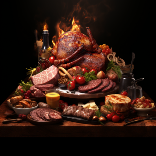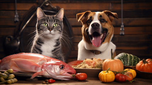 Realistic photo, happy dog and cat, juicy steaks and fresh fish on background, colorful, bright colors, clean picture, ultra realism --ar 1920:1080
