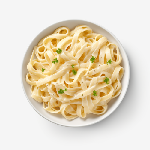 Bowl of fettucini alfredo with garnish isolated on transparent background, top down view, view from above, delicious Italian pasta dish food for menu.