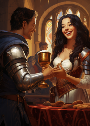 Medieval blackhaired woman serving wine from a large cup to a laughing knight at a feast cartoon realism style --ar 63:88