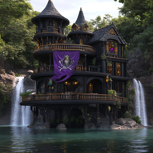 A magical pink floating house on water.