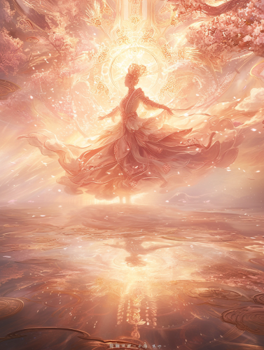 Goddess Guanyin, a person with a pink and white layered skirt, in a Rococo style, with a pink color palette of light white and pale pink. Cherry blossoms, shimmering water reflections, floating magical symbols, showcasing energy and flow, surreal and ethereal artwork, blending elements of reality and fantasy, intricate patterns, delicate lines. --ar 3:4 --niji 6 --style raw