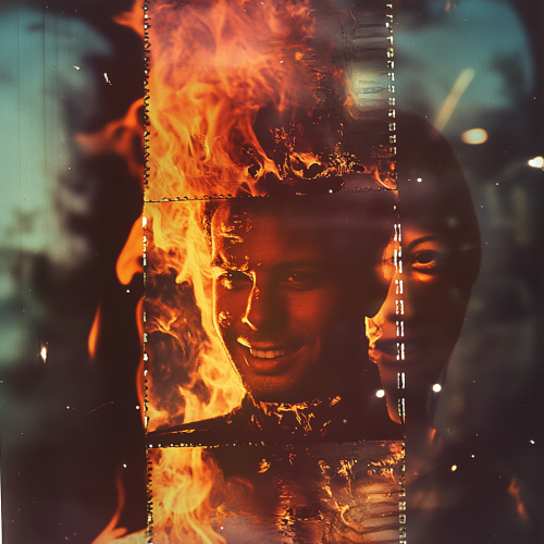 35mm film strip, the cells showing a burning man, spliced in over his face is another film cell of smiling women, photorealistic, portrait poster, film grain, kodak stock