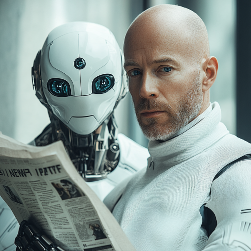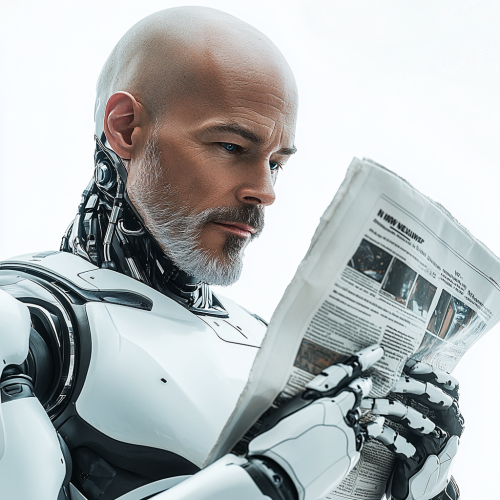 a hyper realistic photo for an AI Newletter where an AI robot gives a newspaper to a highly attractive bald Swedish futuristic middle aged blue eyed man white background. Nikon D850, 85mm lens, f/1.8 aperture --style raw --ar 1:1 --s 250