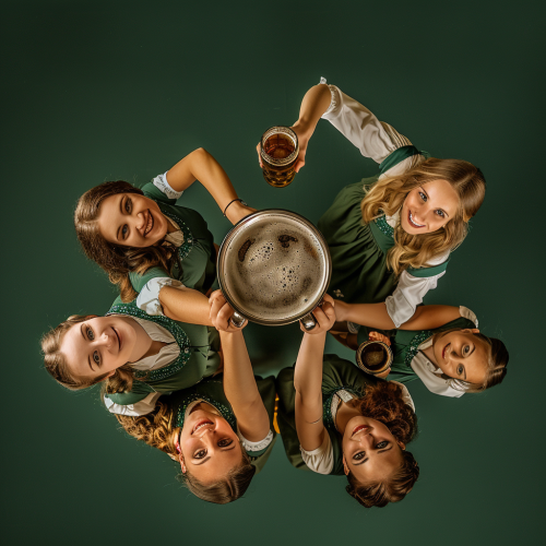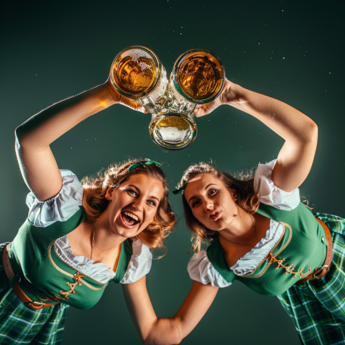 angle from below looking up. two attractive women. the women are wearing green dirndls. the women are each holding very cold large delicious Oktoberfest beer mugs filled with beer. small splash. glass toasting. on a plain dark green background --s 50 --v 6.0