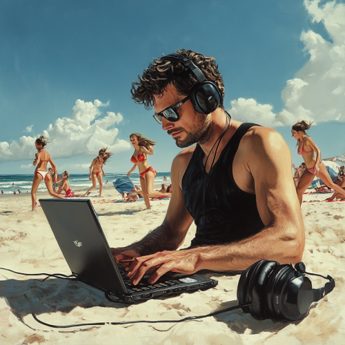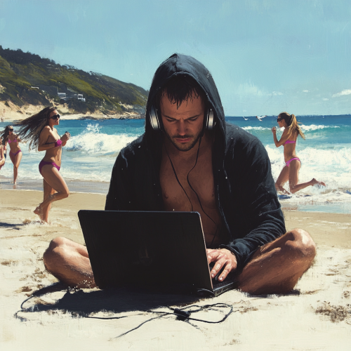 a pale streesed out man in his 30s wearing black cloths and headphones hunched over intensly working on his laptop at the beach on a sunny day while beautiful women in swimsuits are running around having fun