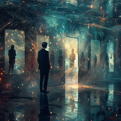 brunette man looking at many doors with silhouettes of women, surreal constellation, half underwater with stars and streaks of light, realistic photography