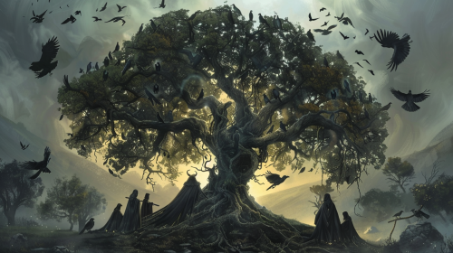 A Wych Elm tree made of pulsating souls with ravens as leaves. A coven of five spellcasters encircle the base of the wych elm tree.::3 --aspect 16:9 --version 6.0