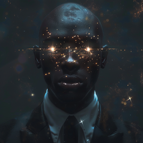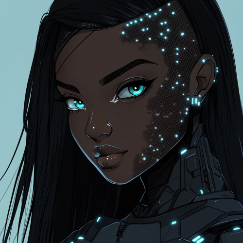 A young black woman, late twenties. her skin has cyberpunk accents, as well as tiny hexagon-like pattern on her skin. She wear very technological-style clothes, has very shiny turquise eyes, and has long straight hair. anime style