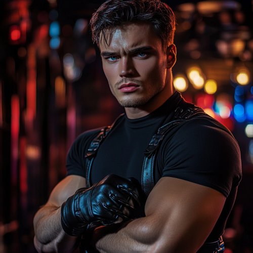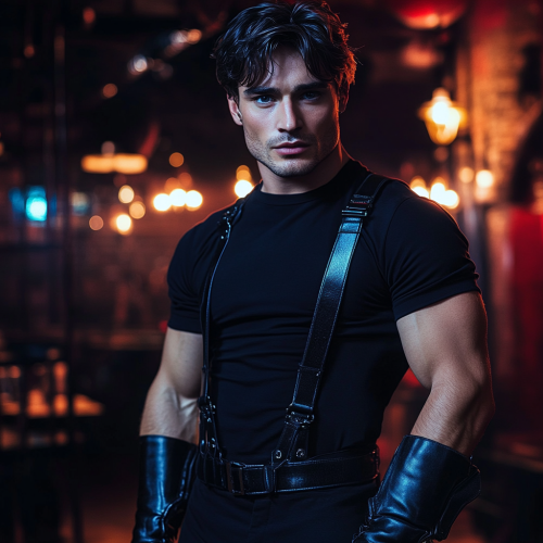 realistic photographer a man, very handsome, dark hair and blue eyes, serious and mischievous look, dressed in black trousers, black t-shirt and black suspenders, men's fingerless leather gloves, in a nightclub