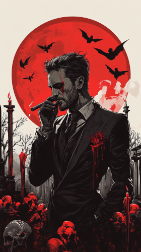 hand drawn style image with dominant black and red colors, highlighted, brown skinned man, dark look, marked jaw, black period formal clothes, smoking a cigar, in a cemetery, lost souls flying around, candles, skulls, moon in the background, spiritual atmosphere, hand drawn style, focus on black and red colors, focus on every detail, sharp details, high quality, high quality graphics, 4k, artstation --v 6.1 --ar 9:16