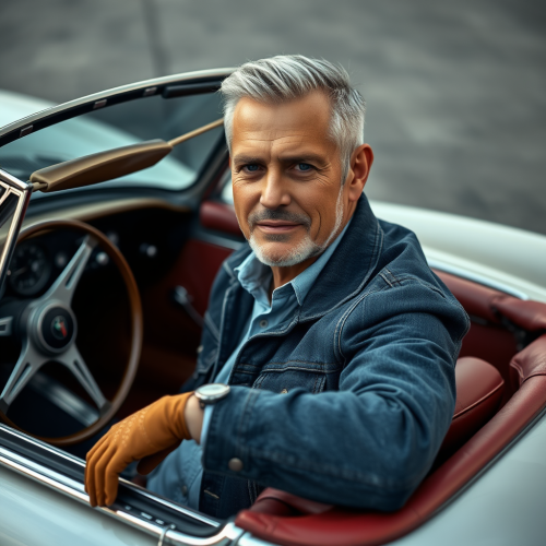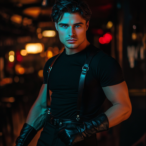 realistic photographer a man, very handsome, dark hair and blue eyes, serious and mischievous look, dressed in black trousers, black t-shirt and black suspenders, leather gloves without half fingers for a biker man, in a nightclub