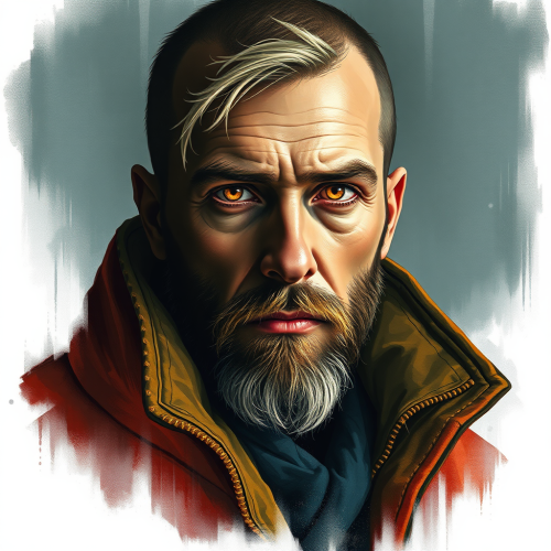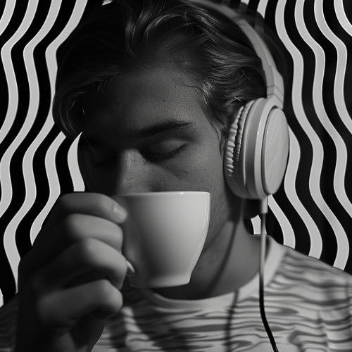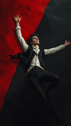 2 sides of the screen separeted black and red background diagonally. In the center of the picture is a young man hanging in the air, his body pulled from both sides or red and black part of screen. He have black hair, eyes dark blue. He wore simple clothes in stile France in the early 19th century in light colors. super detail, ambient occlusion, volumetric lighting, high contrast, HDR, 8K --ar 9:16