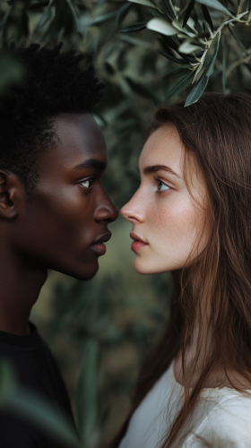 Real photo of a black sudanese young man facing a white brunette young woman, profile of head and shoulders, they are in love, they look into each other's eyes, modern clothes, clean sharp focus, depth of field, cinematic lighting, photo shot in the style of hasselblad h6d-400c, editorial photography. Plain olive tree wallpaper texture background, style raw, 8k, high resolution, --ar 9:16