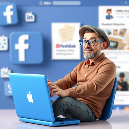 create a 3D illustration featuring a realistic man of age 40 casually sitting on a blue apple mac book infront of social media logo, specially "Facebook". the character should look like he is a graphic designer and freelancer. The background of image should showcase a social media profile page real data with design tools and the username "Ali STOREDZ" and matching profile picture.