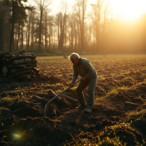 A man working in a sunny field with wood.