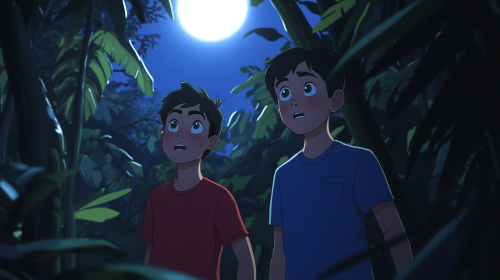 Mark a boy, wearing a blue shirt, and James a boy, in a red t-shirt, standing under the moonlit jungle canopy, looking around with concern. Mark, with a frustrated expression, says, James, curious, asks, The dense jungle surrounds them, with towering trees and rustling leaves, while the glow of the moon casts shadows on their faces. In the background,, they realize they need to head home. Animated, vivid, ultra realistic,. --ar 16:9