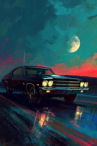 broad strokes digital art of a of a black Chevrolet El Camino speeding down the road in the badlands, night, moon, two people in a car --ar 2:3 --v 6.0