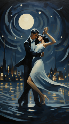 Abstract painting of Big moon in the sky over the lake. It slightly illuminates the water on which the boat is sailing. There is a boy standing there with a stick in his hands, which he uses to push himself away. A happy dog sits in the back with his tongue hanging out