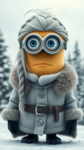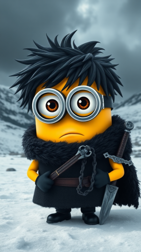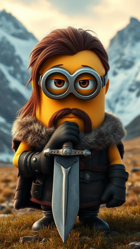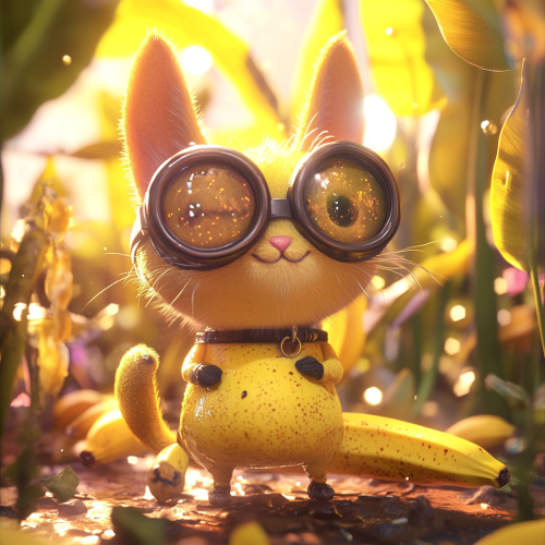 A whimsical fantasy cat with minion characteristics. The cat’s body is yellow and banana-shaped, with large, expressive minion goggles and a small, cheerful smile. The setting is magical, with enchanted banana plants and glowing elements, adding a fantastical touch to the minion-cat fusion. 4K, HDR, highly detailed