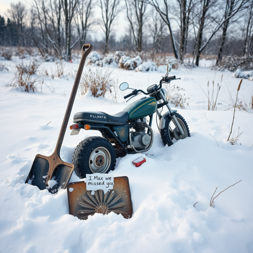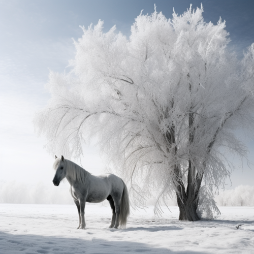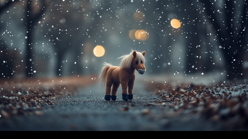 We see a small, cute stuffed horse toy walking on a path in a park. The horse has a soft, plush texture, with a fluffy mane and tail. It's Christmas, with light snow falling, creating a cozy and moody atmosphere. --ar 16:9