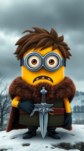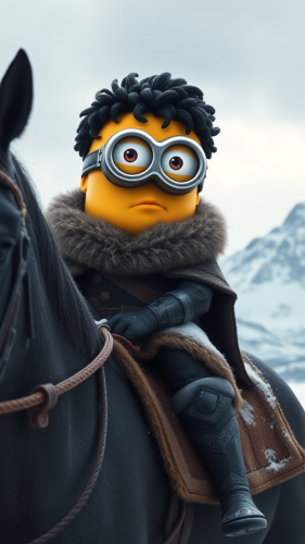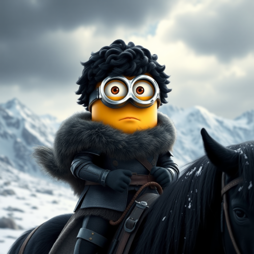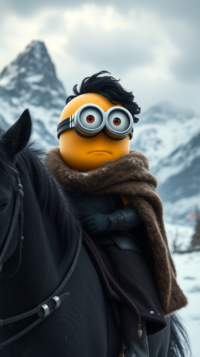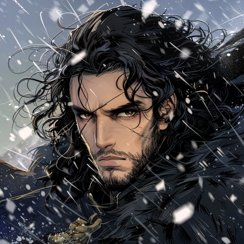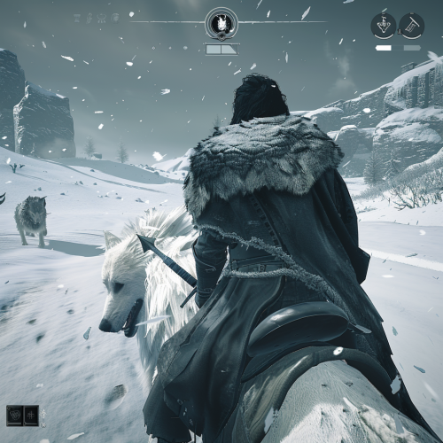 A realistic photo of Jon Snow riding his direwolf Ghost, in the snowy lands beyond the Wall. He is wearing his Night’s Watch cloak and holding his sword Longclaw. He is facing a group of wildlings and wights, ready to fight. The game’s logo and HUD are visible on the screen, showing the health, stamina, and inventory of the player --v 6.0