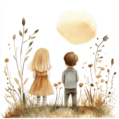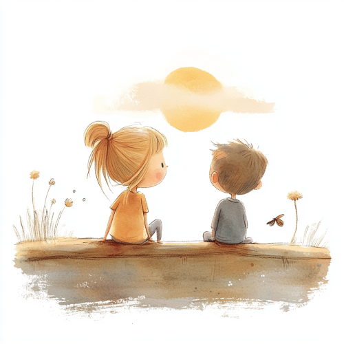 A cute blond girl 4 years old and brwon hair boy 2 years old, sunset, clipart, organic forms, in the style of Jon Klassen, desaturated light and airy pastel color palette, nursery art, white background