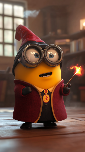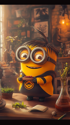 A chibi-style Minion from Despicable Me dressed as a Hufflepuff student. The Minion is wearing a yellow and black Hufflepuff robe and is cheerfully working on a magical project, like brewing a potion or planting magical herbs. The setting includes elements of the Hufflepuff common room or a magical garden, with a warm and friendly atmosphere. High quality, 8k resolution. --ar 9:16