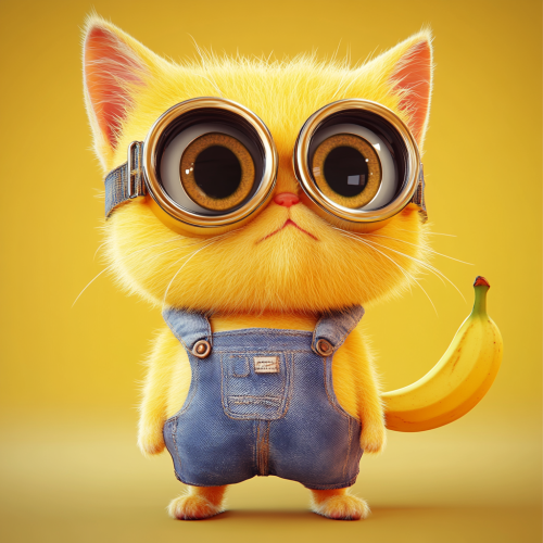 A cute chibi cat with minion-inspired features. The cat has bright yellow fur and wears the classic minion goggles and overalls. Its body is slightly elongated and curved like a banana, with a playful and mischievous expression. The background is simple and colorful, highlighting the adorable hybrid. 4K, HDR, highly detailed