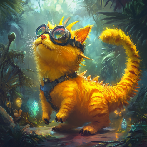A fantastical creature blending a cat and a dinosaur with minion features. The cat has vibrant yellow fur and wears minion goggles, combined with dinosaur characteristics such as small, scaly plates along its back and a playful, tail-like appendage. Its stance is upright and slightly reptilian, with a mischievous grin. The setting is a magical prehistoric jungle with glowing plants and mystical crystals, enhancing the whimsical fusion of cat, dinosaur, and minion elements. 4K, HDR, highly detailed