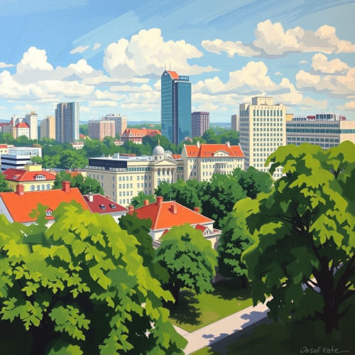 A wide-angle cityscape of a futuristic, fully sustainable city, showcasing green rooftops, solar panels, wind turbines, and eco-friendly public spaces, with a prominent, ultra-modern building as the centerpiece, featuring innovative design with glass, steel, and vertical gardens, bustling with people and electric vehicles, in bright daylight, shot with a Sony A7R IV, 28mm lens, vibrant colors highlighting greens and blue