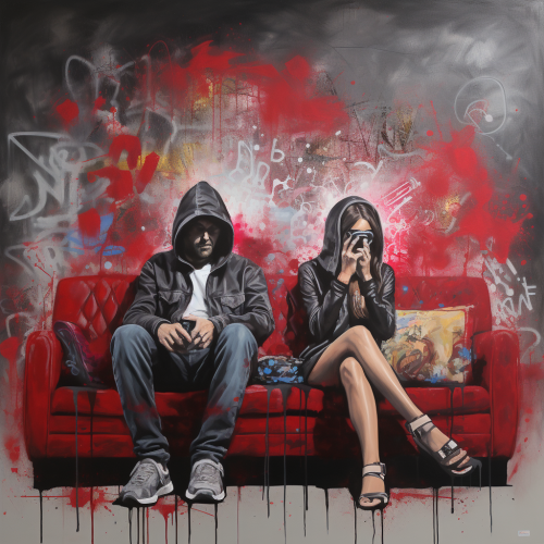 /couple chilling on sofa, both have mobile phones in the hand, background a red graffiti with a symbol “ no mobile phones”, banksy style