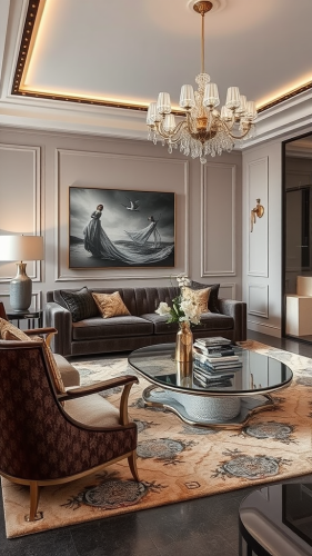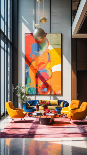 Ultra Luxury modern lounge interior designed by foster + partners with a painting on the main wallFull length photo. Morning Sun Light, Bright Colours. Photographed by AnRong Xu, Canon EOS R5 with an 80mm f/ 2. 4 lens. The color have been expertly graded, giving the image a rich and vibrant look. Captured in stunning 8k high definition, every detail is crystal clear --ar 9:16 --v 5.2