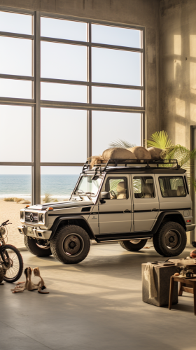 Kleit — hoy a las 13:57 A loft in front of the beach decorated in industrial style with huge windows and leather furniture, inside the hangar there is a mercedes g wagon and a ducatti scrambler motorcycle, through the windows you can see the sea and the scene of the day is the sunset, hyperrealistic and cinematographic style. --ar 9:16