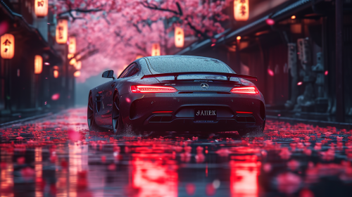 Kenki Fujioka art style, mercedes benz Yakuza, black is the main color, wide wheels, lots of exhaust tips, colorful, sharp eyes, clear bodyline, siluettes, wide angle, ultrahigh definition, high contrast, high quality manga still, stained, attractive, ethereal light,backdrop, vivid and vibrant --stylize 750 --style raw --v 6.0 --ar 16:9