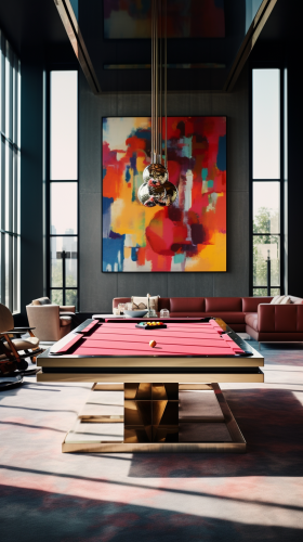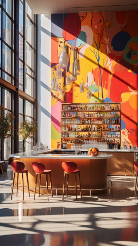 Ultra Luxury modern dining interior designed by foster + partners with a painting on the main wallFull length photo. Morning Sun Light, Bright Colours. Photographed by AnRong Xu, Canon EOS R5 with an 80mm f/ 2. 4 lens. The color have been expertly graded, giving the image a rich and vibrant look. Captured in stunning 8k high definition, every detail is crystal clear --ar 9:16 --v 5.2