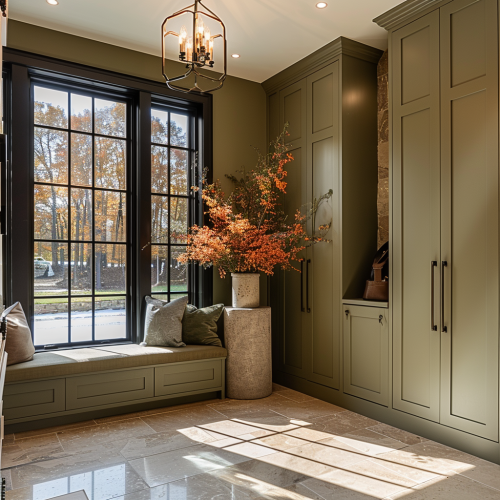 luxury modern organic mudroom. Tile floors. Black lined windows. Olive green wall with inbuilt cabinets for kid’s bags. Minimalist abstract charcoal green cream vintage art on the wall. Modern traditional Light chandelier. tall large vase of orange brown maple flowers. Dark brown oak floors. Layer the room with accent pieces. Fall aesthetics. Realistic style --ar 1:1 --v 6.0 --s 250 --style raw