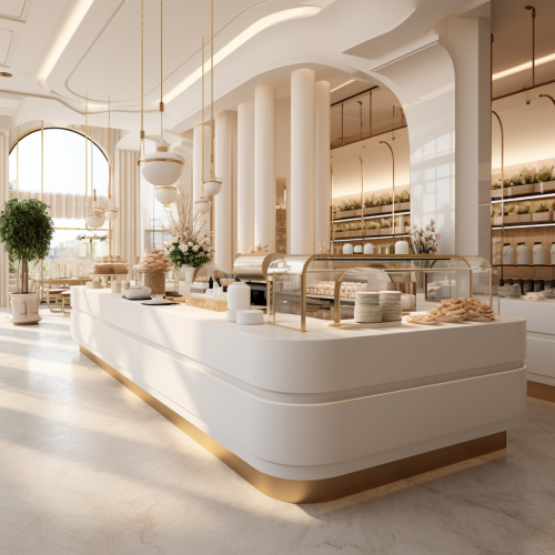 a hyper realistic, modern, luxury white interior, show the inside of a dessert shop with counter to buy from --s 250