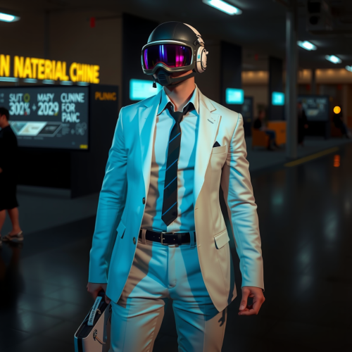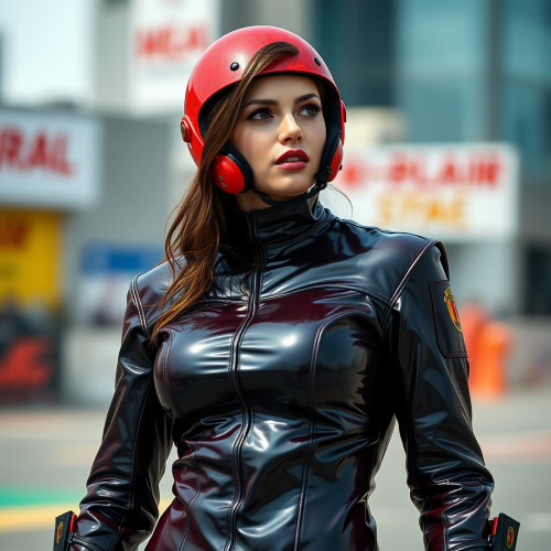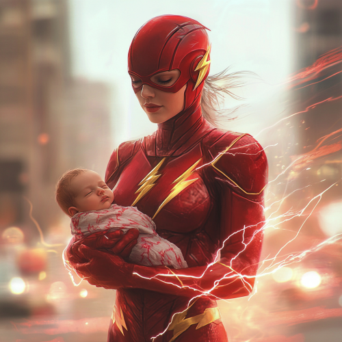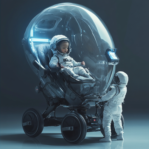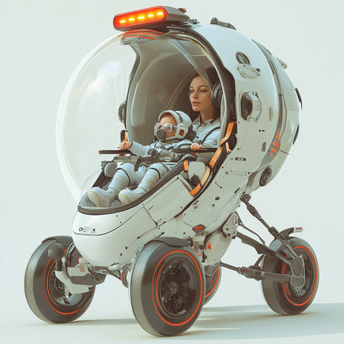 a futuristic baby stroller with armor, weapons, sealed glass chamber and hvac system, a rotating cop car light. The baby is wearing an elaborate oxygen mask. The mom pushing the stroller is wearing a futuristic lean form fitting astronaut suit, and she’s very fit.