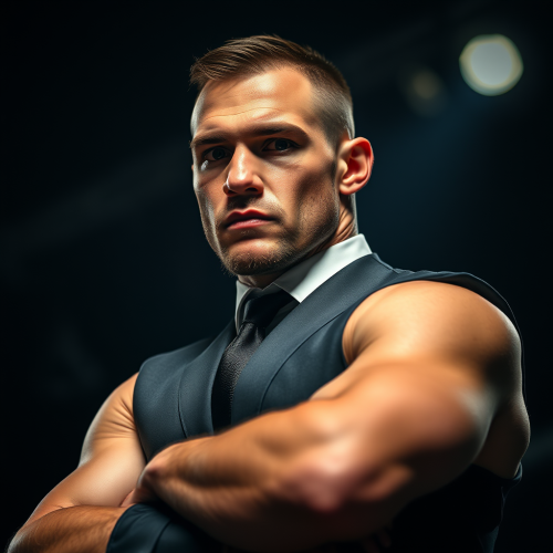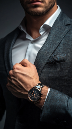 the man is a businessman. I have an expensive watch on my hand. In a suit. Muscular. A brutal man. Strong shoulders. The facial features are detailed. The body parts are detailed. The details of the clothes are detailed. Studio photo on a white background. Serious luxury. --ar 9:16 --style raw --v 6.1