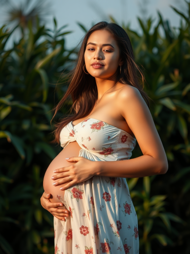 in the early down light, a beautiful young pregnant woman looking at a date circled with a heart in red color on the calender hanged on the wall. She is happily smiling and one of her hand is on her belly. Hyper realistic, warm colors