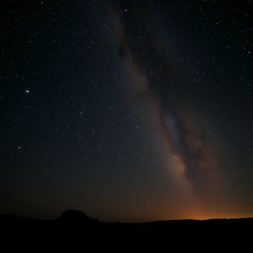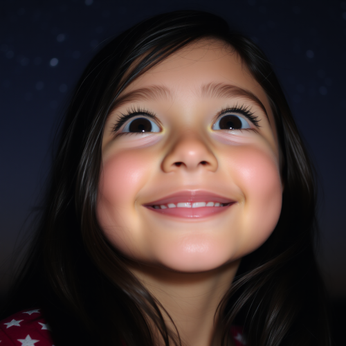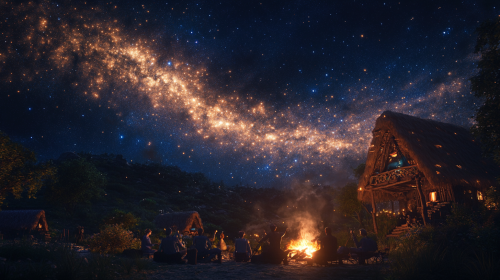 high quality, 4K, photo realistic scene of a galaxy night sky filled with stars, below the sky is a village with people sitting around a campfire telling stories, pointing at the night sky. --ar 16:9
