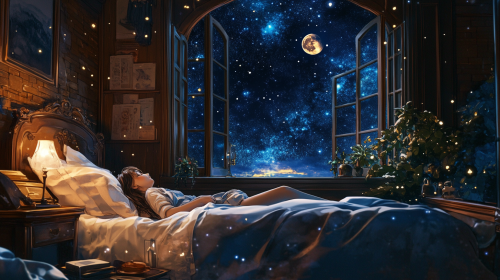 ghibli style, A lovely 20-year-old girl is sleeping soundly on her luxurious bed. At night, she sees a beautiful view of stars and moon outside her window --ar 16:9