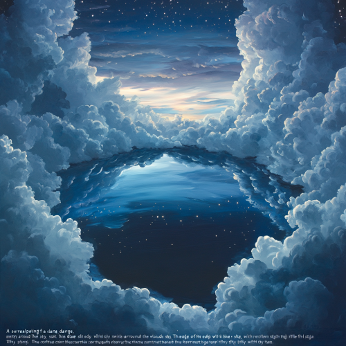 "A surreal painting of a large, dark pool in the sky, surrounded by soft, white clouds floating in a vivid blue sky. The clouds gently swirl around the edge of the deep, still pool, which reflects the night sky with tiny stars. The contrast between the ethereal brightness of the clouds and the calm, mysterious pool creates a dreamlike, otherworldly scene. The pool appears inviting yet ominous, as if it could draw one into its tranquil yet infinite depths."