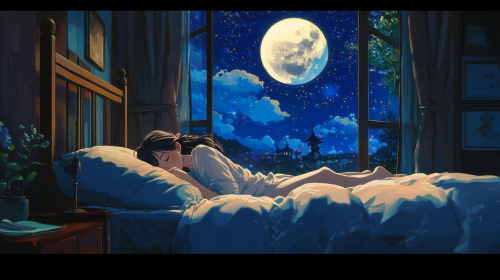 ghibli style, A beautiful 20-year-old girl is sleeping on a beautiful bed with a window that shows a sky full of stars and a smiling full moon --ar 16:9