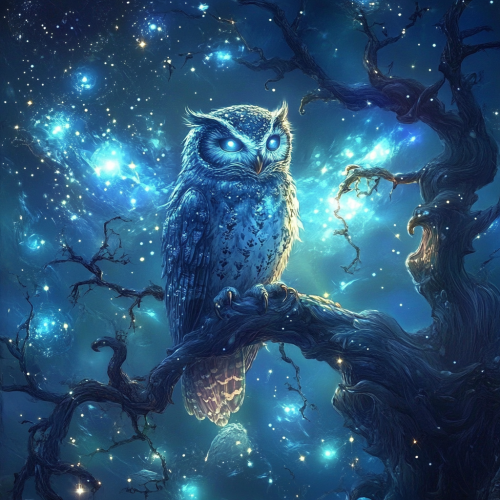 concoct a fantasy-infused rendition of an owl perched on a gnarled branch under a starry sky. Bring on the mystic charm with glowing exes and an aura that blend seamlessly with the ethereal atmosphere