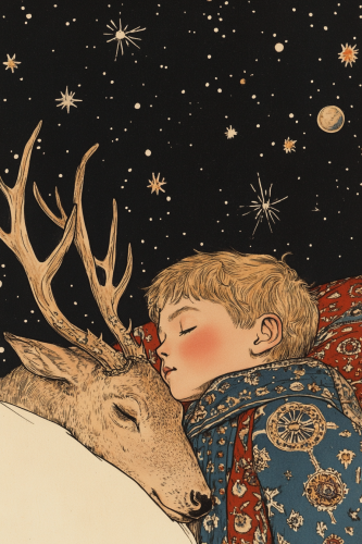 Sleeping boy and deer on night sky background. Slavic folk art, children's illustrated books in the style of Carson Ellis --ar 2:3 --style raw --s 250 --sref 102386141 668481136 4161683524 72071720 5256007 182924195 --p 5vt1sg7