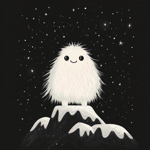 A simple illustrated scene of a large, ghostly Yeti standing on a snow-covered mountain against a solid black background under a dark, starry sky. The Yeti is designed in a cute, child-friendly style, with a fluffy, rounded appearance, soft white fur, and a big, happy face with gentle eyes, radiating warmth and friendliness. The contrast of the solid black background enhances the Yeti’s snowy white fur and the soft glow around it, while twinkling stars add a cozy, magical feel, creating a peaceful and inviting atmosphere for this whimsical character.